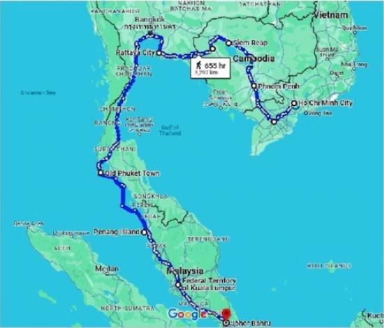 Feb 17: Johor Bahru to Singapore (34 km)Across the causeway. We have arrived, journey's end. 2600 km in total. 08/01/24 to 17/02/24.The Merlion - The Merlion is a mythical creature and symbolises Singapore's origins. The head represents the citiy's original name Singapura.