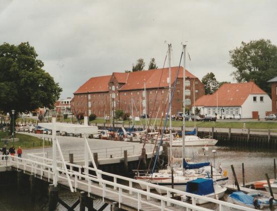 We stayed for a day in the lovely town of Tonning, near the mouth of the river. The harbour is mentioned in the book when Davies had sailed up the river. We were allocated a place by the footbridge where we just remained afloat, although most of the harbour dries. "Juliet", with her red gunwale stripe, can be see in the foreground of the picture.